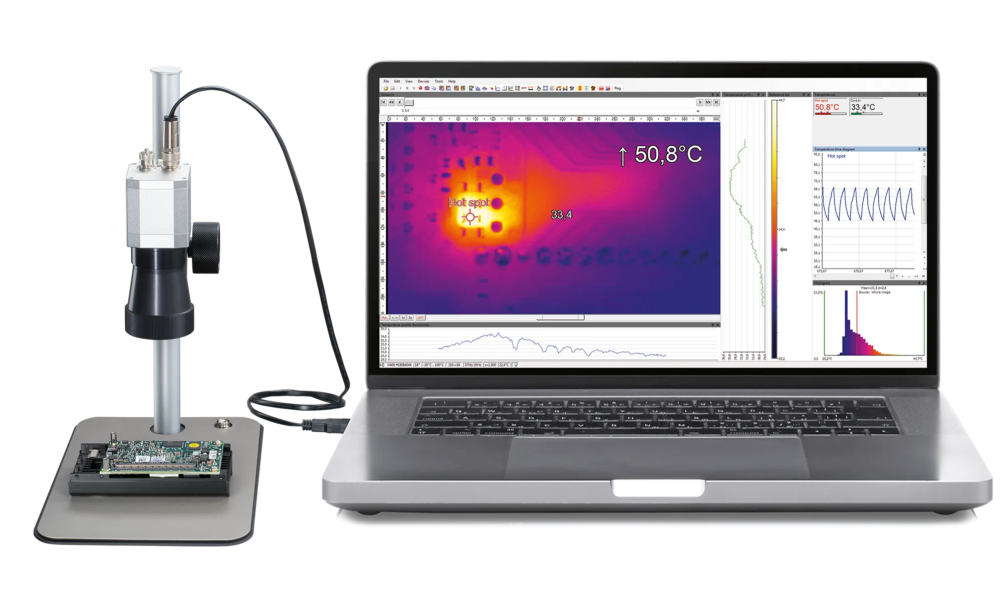 Optris 현미경 광학(Microscope lens) 키트는 PI 640i 열화상 카메라 사용자 중 다른 교환형 광학을 사용하는 고객을 위해 설계된 액세서리입니다. 최적화된 현미경 렌즈를 통해 전자 기판 및 소형 칩 수준 부품의 열 분석이 가능하며, 최소 28 μm 해상도를 제공합니다. 고성능 열화상 카메라는 카메라의 VGA 해상도를 지원하며, 높은 감도와 낮은 열 잡음으로 작은 대상도 정밀하게 측정할 수 있습니다. 키트에는 현미경 스탠드가 포함되어 있어 핸즈프리 작업이 가능하며, 측정 대상과 카메라 간 거리를 80~100 mm로 조절할 수 있어 전자제품의 기능 테스트와 방사선 측정을 동시에 수행할 수 있습니다.
