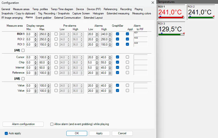 알람은 온도, 변화율, 표준편차, 설정된 임계값을 초과하는 픽셀의 비율, 또는 두 측정값 간의 차이 등 다양한 기준에 따라 트리거될 수 있습니다. 시각적 경고뿐만 아니라 청각 알람도 설정할 수 있어 모니터링 효과를 한층 강화합니다.