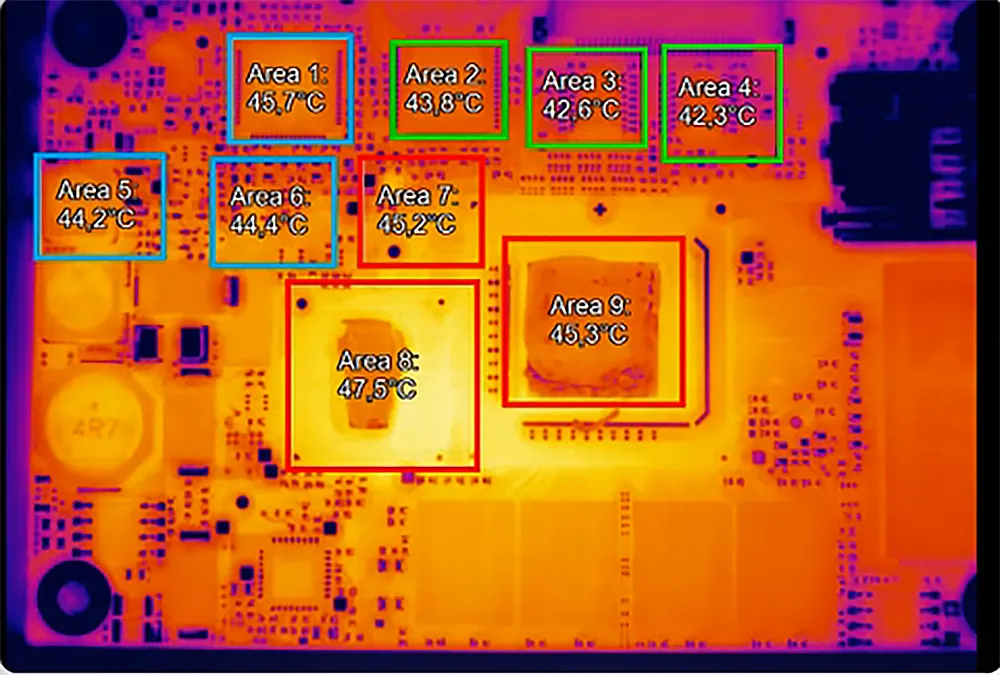 이 시스템은 장파장 적외선 카메라와 정밀 현미경 포커스 스테이지, 소형 대상에 최적화된 독일 엔지니어링 광학을 결합하여, 혼잡한 PCB와 섬세한 전기 구조물에서도 정확한 비접촉 온도 측정을 제공합니다. 최소 측정 스팟 크기는 80 µm(IFOV)이며, 정의된 MFOV는 240 µm로, 온도 변화와 절대 온도를 모두 신뢰성 있게 확인할 수 있어 부품 사양 검증이나 국부적 과열 지점 탐지에 매우 적합합니다. 기존 대형 대상용 적외선 시스템과 달리, 이 카메라는 짧은 거리와 작은 부품에서도 높은 정확도를 유지합니다.